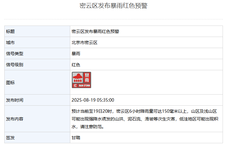 北京Miyun和Huayu地区由于大雨而发出红色警告 – 北京新闻