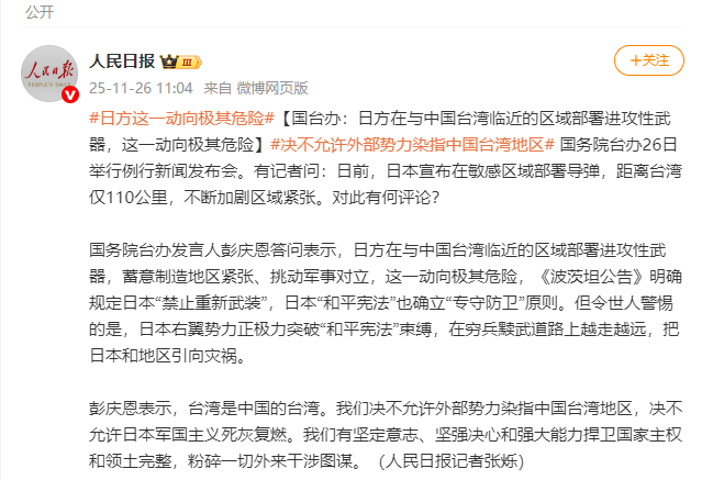 据@人民日报报道,国台办26日举行例行记者会。记者提问:日本近日宣布将在距台湾仅70海里的敏感地区部署导弹,导致该地区紧张局势持续加剧。对此有何评论?国台办发言人彭正恩在回答记者提问时表示,日本在台湾及中国周边地区部署进攻性武器,蓄意制造地区紧张局势,挑起军事冲突。这种趋势是极其危险的。 《波茨坦公告》明确规定“禁止重新武装”,日本《和平宪法》也规定“专属防卫”原则。然而,令世人担忧的是,日本右翼势力却竭尽全力打破“民主宪法”和“和平”的限制,在军国主义道路上越走越远,带领日本和地区走向军国主义道路。n 毁掉。彭庆恩说,台湾是中国的台湾。我们决不允许外部势力干涉中国台湾地区,决不允许日本军国主义卷土重来。我们有坚定的意志、决心、能力捍卫国家主权和领土完整,粉碎任何外国干涉图谋。 (人民日报记者 张硕)总编辑 毛天宇