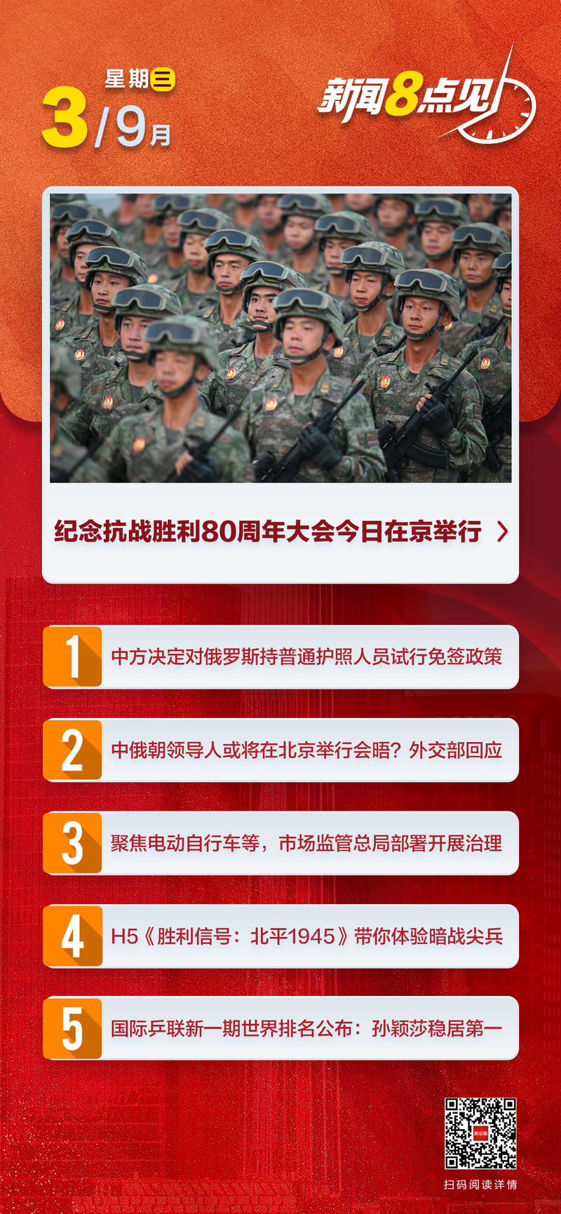 [目前的问题]一个会议和一个文学之夜,纪念中国抵抗日本入侵80周年,以及今天在北京举行的世界反法西斯战争的胜利。 9月3日,日本袭击胜利80周年和反对世界反法西斯战争的抵抗战争。当天上午9点,在北京的天安门广场举行了纪念会议。 CPC中央委员会秘书长,中华民国总裁兼中央军事委员会主席习近平将发表重要的演讲并审查军队。晚上8点那天,文学之夜“维多利亚·德拉·贾斯蒂亚(Victoria de la Justicia)”纪念中国人民抵抗日本入侵的胜利80周年,并将在北京大会上举行反法西斯战争的胜利,并将在北京大会上举行,并将被XI Jinping和其他助手和其他助手看到。(ofxinhua新闻)阅读完整的历史>>>更多的现场会议,纪念日本抵抗战争80周年对入侵和世界上的反法西斯战争的纪念,这是国家重要武器的明显形象。 93军事游行部的《快速收集:没有签证的政策》的监视指南正在驾驶定期护照的俄罗斯人。 9月2日,外交部发言人郭Zi-kung主持了常规新闻发布会。 Guo Jiakun表示,为了进一步促进中国和国外之间的人事交流,中国已决定扩大免费签证国家的范围,从2025年9月15日至2026年9月14日,将对拥有普通护照的俄罗斯人民实施免签证政策。 (CCTV新闻)阅读全文>>>>中国,俄罗斯和北部的领导人可以韩国庆祝会议?外交部于9月2日与外交部发言人郭Zi-kung组织了常规新闻发布会。记者:有报道称,中国领导人,俄罗斯和朝鲜可以在9月3日的活动中举行会议。发言人是否有特定信息可以提供? Guo Jiakun:我们及时写了日本对攻击和抵抗世界反法西斯主义战争的抵抗和抵抗的80周年纪念日。老实说,我们将发布有关我们活动的相关信息。没有信息可以提供您提到的具体问题。 (外交部的网站)阅读全文>>>商务部的相关官员解释了“合作社Agencyshanghai的宣言主任在多边商业系统的支持下。”上海合作组织峰会最近在天津举行。会议批准并出版了“上海合作组织的多边商业系统支持”负责人。 (国家部门的网站)将全文作为电动自行车。工业产品(2025-2027)。“突出了问题,区域和关键物品,并显示了当地市场监督部门,以调查和管理隐藏的危害。从反贾普尔战争的胜利中,反式战争的胜利,Beijing News,Beijing News是专门计划和互动的媒体媒体的夏季访问:1945年的“胜利”,“经验丰富的工作”。 2025年为北京鸭子鸭国际机场的航站楼树立了新的记录。2025年的夏季(7月1日至8月31日),达奇申斯机场(Dachshunds Airport分别为4.91%和4.84%。与去年相比,国际和区域乘客的数量达到1,0.991亿,年际交往增长13.66%,一般行动显示出恒定的增长趋势。其中,自达奇申德机场(Dachshund Airport)运营以来,七月和八月建立了新的乘客峰值记录。八月的一般乘客数量达到48.735亿。8月20日的乘车和飞行降落数量达到1,108。 (北京达克斯国际机场的官方微博)阅读全文>>> [社交]“更快的护士”能否逃脱公众舆论的涡流?与张夏伊瓦的丈夫的对话:我想恢复事实。 9月2日,福吉安医科大学第一家会员医院的“最快护士”张舒伊亚大喊,在马拉松比赛后引起人们的注意。张夏伊瓦(Zhang Shuihua利用他的休息日参加比赛。该部门在周末有15多名护士和五名或六名护士工作。如果您不需要工作,则可以休息一下。工作的头为彼此。王·凯(Wang Ke)说,执行这场马拉松比赛不是在赚钱,但是与“ MCN”签订合同是参与的份额。在线流通的内容是不完整的,妻子的口头陈述是不正确的,这会导致误解。据媒体报道,医院秘书旺格·安格(Weng Shangeng)表示,如果也不影响工作,将鼓励员工发展自己的利益和爱好。 (北京新闻)视频>>> [财务]北京证券交易所四周年:“新十亿个市场”,大约四年前,有超过900万合格的投资者在9月2日接近。从2021年11月15日启动市场上的81股,直到2025年9月1日,274家贸易公司和一家Al市值超过911亿元人民币,北京Vallas Bang Bell Bech Changic。同时,北京市场的合格投资者人数也已超过1000万,现在已经超过900万。 (北京新闻)阅读全文>>> [文化和体育] ITTF的世界排名世界:全国各地的乒乓球队,属于女性前五名单曲之一,Sun Yingsha在2025年19日,ITTF宣布了他们的36周分类。在P2中,中国球员林·赛卫(Lin Si-dong)和王楚金(Wang Chukin)浪费了男子单打,Lyang Jingonung在前两名中排名第六,Xiang Peng分类。 9º。当涉及女单打时,中国球员孙扬莎(Sun Yingsha)连续164周以12,200分占领了世界第一,王·莫鲁(Wang Manyu),陈宁顿(Chen Xingtong),库伊(Kuai)和王·伊迪(Wang Yidi)被列为前五名,而陈·耶(Chen Yi)则占据了八分之一的位置。 (WTT世界泰尔网球联合会)阅读完整的历史>>]阿富汗地震杀死了1,411人,受伤3124人。在第二个地方时代,阿富汗政府发言人扎比拉·穆贾希德(Zabiula Mujahid)表示,到目前为止,8月31日在阿富汗东部地震造成的死亡人数增加到1,411,另有3,124人受伤。此外,有5,412所房屋被摧毁。 8月31日晚上的下午,当地时间是一场地震,在东阿富汗,深20公里。震中在南加哈尔省的首都贾拉拉巴德附近。 (CCTV新闻)阅读全文>>>日本自由民主党内部的几位主要官员表示,他们打算在当地时间辞职。日本总理和自由民主总统伊斯巴在演讲中再次为参议院选举中的自由民主党失败而道歉,称“适当的决定将在正确的时间做出。”在会议上,自由秘书长艾尔民主党Hiro Moriyama表示辞职的意图。此外,政府对自由民主党,州长铃木总统兼自由民主党选举委员会主席Gonod表示辞职。自由民主总统是民主自由党的领导人。