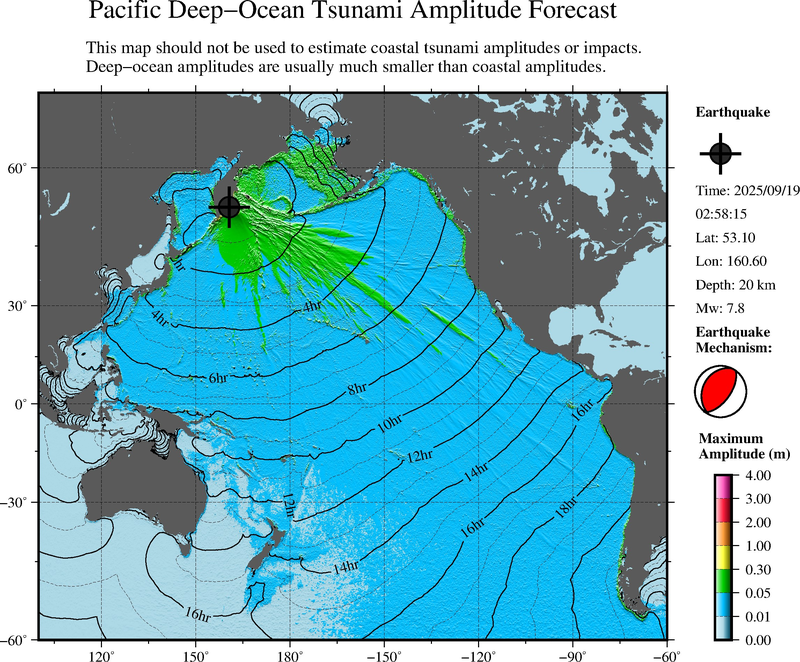 根据北京新闻地震监测站(记者Changjiang lin)的数据,自然资源海啸警告中心确定,在Kamchatka东海岸的高海水中发生了7.8级地震,于2025年9月19日(北京时间)于2025年上午2:58(北京),成本为160.6°n,Coast of op osh om and Coast。公里(由原始参数进行审查)。根据上次监视和分析,自然资源部的海啸警告中心说,地震造成了海啸,但对我国的海岸没有灾难性的影响。地震和海啸的数值计算结果图。自然资源部提供的海啸警告中心这次地震发生在太平洋板块和北美板块附近,是一种典型的浅字体反向故障活动。在焦点区域,太平洋的盘子向西北移动到西北的盘子每年约77毫米的速度。这个震中地区一直是中度至重要地震的常见区域。地震是2025年7月30日在Kamchatka半岛8.7地震的最大复制品,超过1952年9月13日发生的幅度的7.4副本的幅度是垂直垂直Tsunami附近的强度9.0的强烈地震。地震的历史数据是1952年11月4日发生的最大幅度9.0地震,距离源距离500公里中的23次地震事件大于7.0。 1952年,在太平洋边缘地区约有10,000人死亡,杀死了最大的海啸,高18.4米。历史地震分布图和海啸事件。根据海啸的全球监视数据,centtsunami自然资源警告提供的照片表明,地震在焦点附近引起了海啸。在2025年9月19日上午8:45(北京时间),Amytka Island站(N 51.4°N,179.3°E)监测了4厘米海啸。 Float 21414(49°N,178.2°E)监测了5厘米海啸。 Float 21415(N,50.2°N,171.9°E)监测了6厘米海啸。自然资源部的海啸警告中心是世界水下地震几乎是现实的愿景。根据IMSource机制的解决,地震是反向故障的地震事件。原点机理的解溶液平面的几何参数如下:方向角:212°,倾斜角:18°,滑动角:84°(第一部分)。方向角38°,72°倾斜角和滑动角92°(第二部分)。通过基于实际障碍的几何参数应用N模型来获得的结果表明,地震可能导致太平洋海岸沿线的5-30 cm海啸。在预警信息方面,海啸自然资源部的警告中心很快对地震事件做出了回应,在北京时间3:06释放了海啸的第一条信息,并发布了地震周围地区的海啸预览。警察。随着源信息的持续更新,预警中心继续跟踪,并在8:28和7.8审查其大小。海啸的第二个信息是根据最新的数值结果和实时监视信息发布的。从2025年9月19日,北京时间上午8:45,地震中没有重要的伤亡。 Liu Mengjie编辑Profirrioner Yang Li