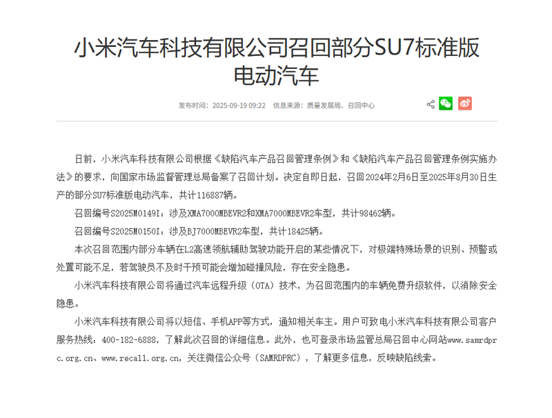 根据国家管理网站对北京新闻市场的监管,小米汽车技术公司有限公司最近根据“管理有缺陷自动产品的恢复恢复的法规”的要求,对国家监管的国家管理部门进行了恢复计划。已经决定,它将记住2024年2月6日至2025年8月30日生产的电动汽车的标准版本,总共116,887人。恢复编号S2025M0149I:XMA7000MBEVR2和XMA7000MBEVR2型号,总计98,462辆。恢复号S2025M0150I:包括BJ7000MBEVR2型号,总计18,425辆。如果启用了高速飞行员辅助功能L2,则可以识别特殊的极端场景,预警或丢弃可能不足。如果驾驶员不能间隔随着时间的推移,碰撞的风险增加,并且可以增加安全风险。小米汽车技术有限公司,通过汽车远程更新技术(OTA)更新恢复范围内的车辆软件,以消除安全风险。小米汽车技术有限公司将通过短信,移动应用程序等通知相关汽车的所有者。用户可以获取有关小米汽车技术有限公司的恢复详细信息的更多信息。直接客户服务线:您可以致电400-182-6888。此外,登录到市场法规中的国家行政恢复中心网站www.samrdprc.org.cn和www.recall.org.cn和www.recall.org.cn,并根据W Wechat(Samrdprc)的官方说明(SAMRDPRC)学习更多信息,并反映有缺陷的信号。 XIN JING编辑