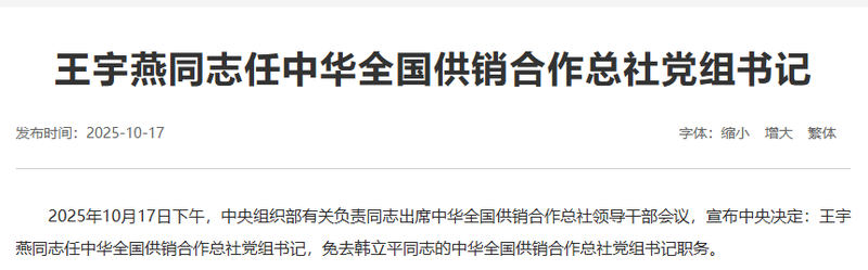 新京报讯 据中华全国供销合作总社官网消息,2025年10月17日下午,中央组织部负责同志出席中华全国供销合作总社主要领导会议并宣布中央决定。合作社及韩立平同志免去中华全国供销合作总社党组书记职务。编辑 申真